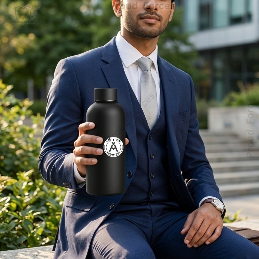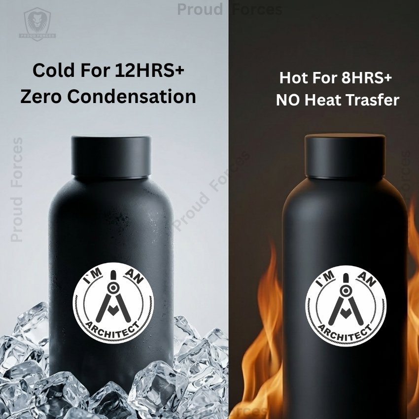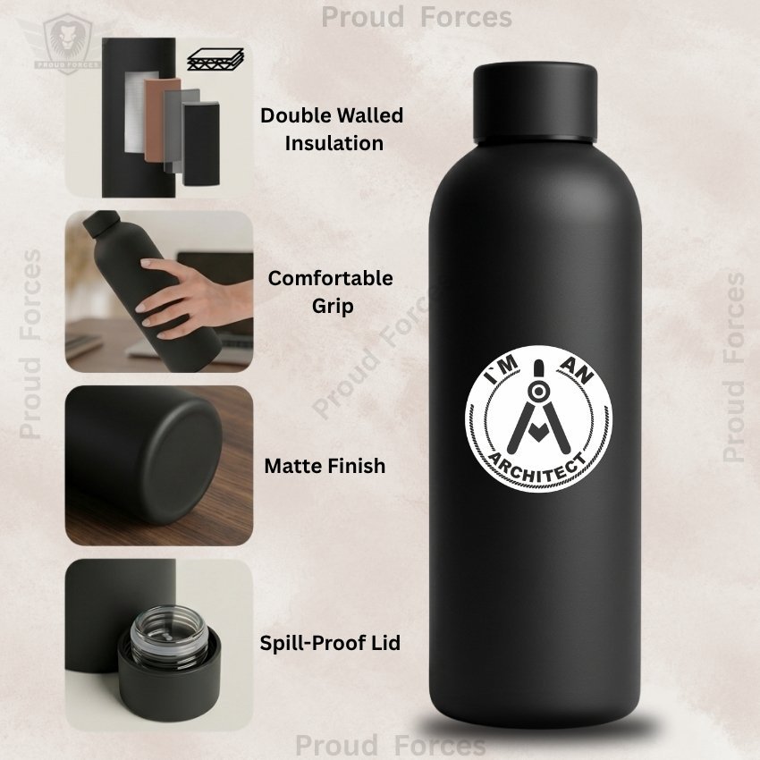 The Architect Insulated Water Bottle by Proud Forces is a premium matte black stainless steel bottle designed for daily use with durability, comfort, and a refined professional look. Featuring a centrally placed Architect sticker, this bottle offers efficient temperature retention and a sleek finish, making it ideal for office use, travel, site visits, and everyday routine.