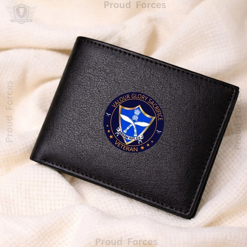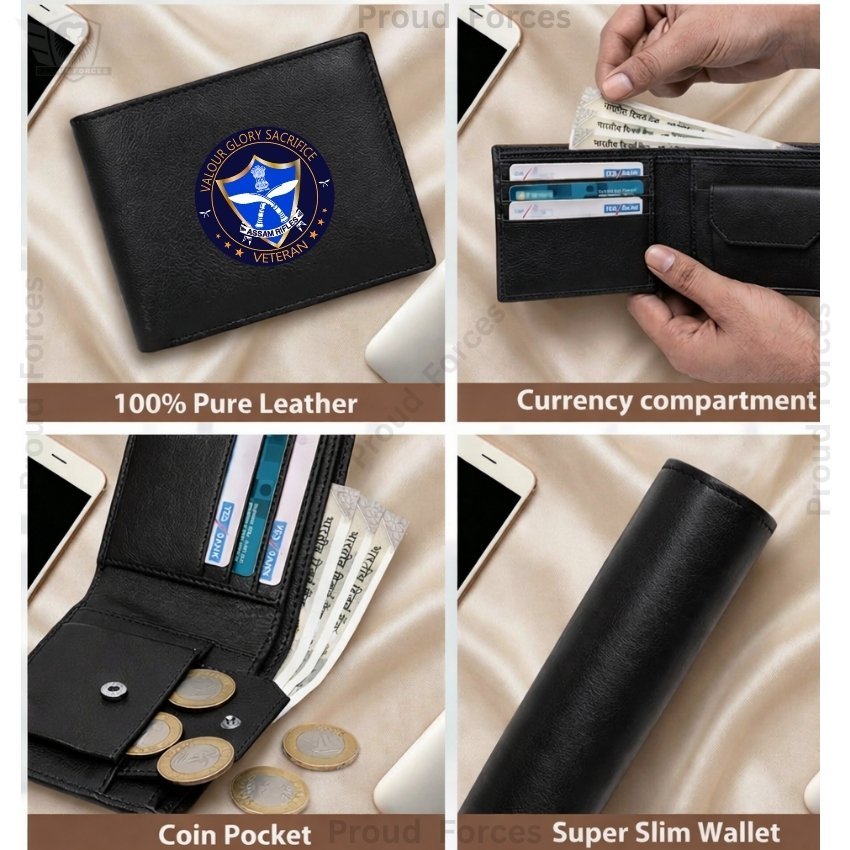 The Assam Rifles Veteran Black Leather Wallet for Men by Proud Forces is a premium classic wallet crafted from 100% genuine black leather, combining durability, elegance, and veteran-inspired pride. Featuring a centrally placed Assam Rifles Veteran sticker, this super slim wallet keeps your cash, cards, coins, and essentials organized, making it perfect for daily use, office, or travel.