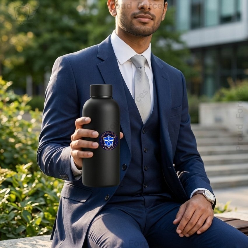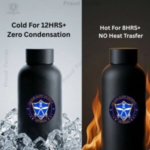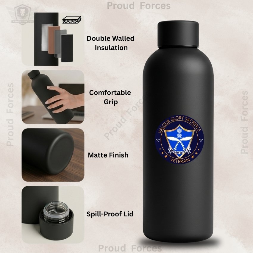 The Assam Rifles Veteran Insulated Water Bottle by Proud Forces is a premium matte black stainless steel bottle designed for everyday durability, practical use, and identity-driven style. Featuring a centrally placed Assam Rifles Veteran sticker, this bottle offers reliable temperature retention and a sleek matte finish, making it ideal for office use, travel, duty hours, and daily hydration.