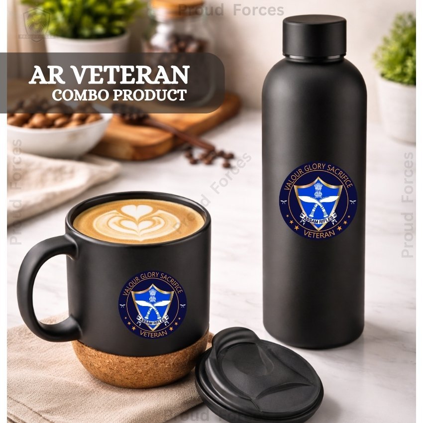 The Assam Rifles Veteran Matte Finish Bottle & Coffee Mug Combo Set by Proud Forces is a premium daily-use combo designed for convenience, durability, and smart presentation. Both the insulated bottle and coffee mug feature a centered Assam Rifles Veteran sticker, giving the set a matching identity-inspired design. The bottle helps maintain beverage temperature for long hours, while the mug offers a removable cork base and leak-proof lid for comfortable everyday use.