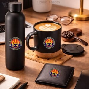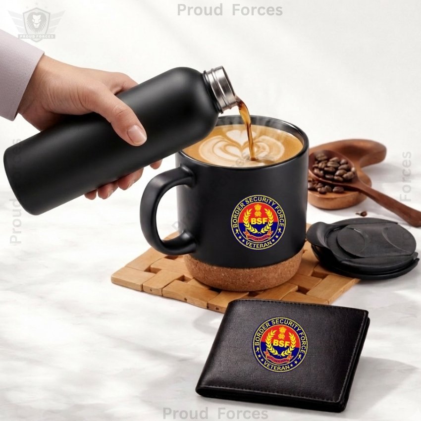 The BSF Veteran Premium Combo Pack of 3 – Bottle, Coffee Mug & Leather Wallet by Proud Forces is a premium everyday utility combo designed for comfort, durability, and daily convenience. This set includes a matte finish insulated water bottle, a matte black coffee mug, and a 100% genuine leather wallet, all featuring a centered BSF Veteran sticker for a matching premium look. It is ideal for office, travel, home, and gifting.