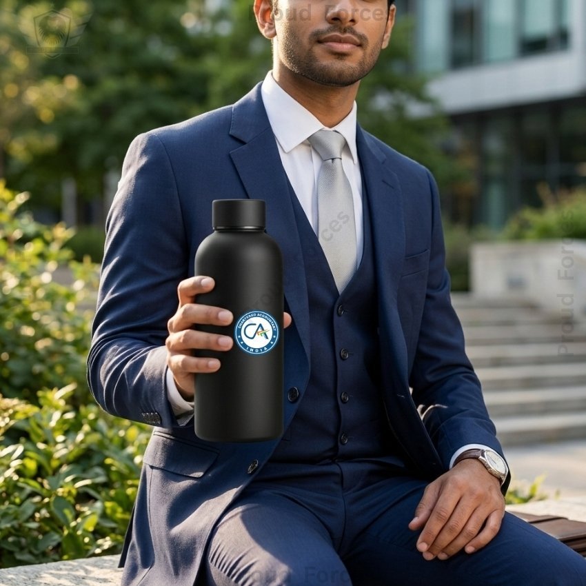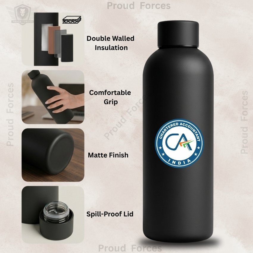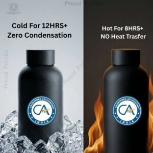 The CA Insulated Water Bottle by Proud Forces is a premium matte black stainless steel bottle designed for daily durability, professional use, and clean identity-driven style. Featuring a centrally placed CA sticker, this bottle offers reliable temperature retention with a premium matte finish, making it ideal for office use, meetings, travel, and everyday hydration. Similar matte-finish insulated bottles commonly use double-wall vacuum insulation and leakproof lids for long temperature retention, which aligns with this bottle’s design category.