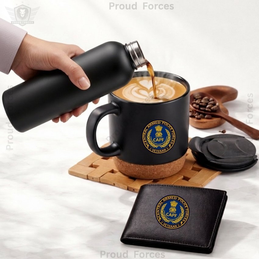 The CAPF Veteran Premium Combo Pack of 3 – Bottle, Coffee Mug & Leather Wallet by Proud Forces is a premium everyday utility combo designed for comfort, durability, and daily convenience. This set includes a matte finish insulated water bottle, a matte black coffee mug, and a 100% genuine leather wallet, all featuring a centered CAPF Veteran sticker for a matching premium look. It is ideal for office, travel, home, and gifting.