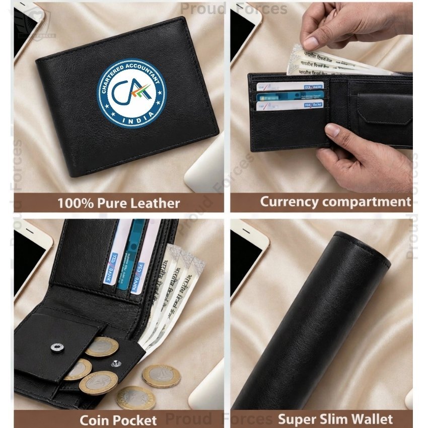 The Chartered Accountant (CA) Black Leather Wallet for Men by Proud Forces is made from 100% genuine black leather and designed for premium daily use. Featuring a centered CA emblem sticker, this slim wallet offers practical storage for cash, cards, and essentials while maintaining a clean, professional, and classic look.