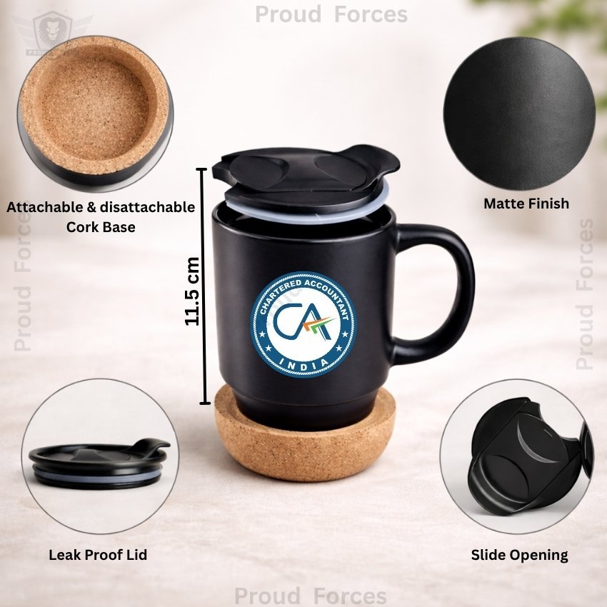 The Chartered Accountant (CA) Matte Finish Coffee Mug with Cork Base by Proud Forces is a premium black matte finish mug designed for daily comfort, professional style, and practical use. Featuring a centrally placed CA sticker, this mug comes with an attachable and detachable cork base, making it easy to use and simple to clean. Its leak-proof lid and slide opening design make it suitable for tea, coffee, and other beverages during office work, meetings, or travel.