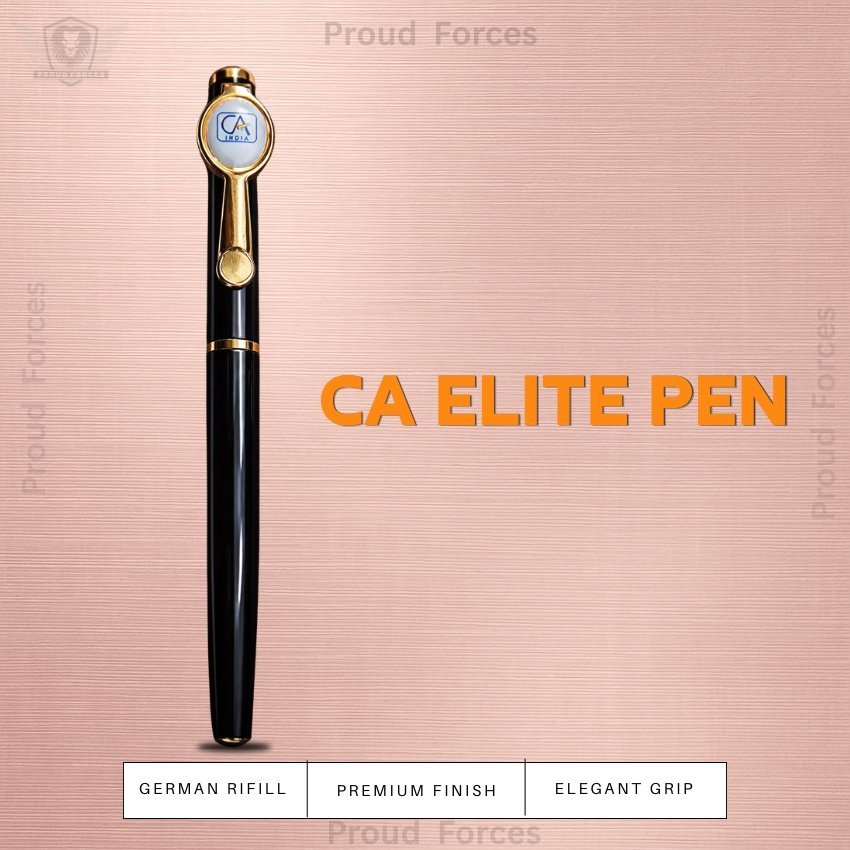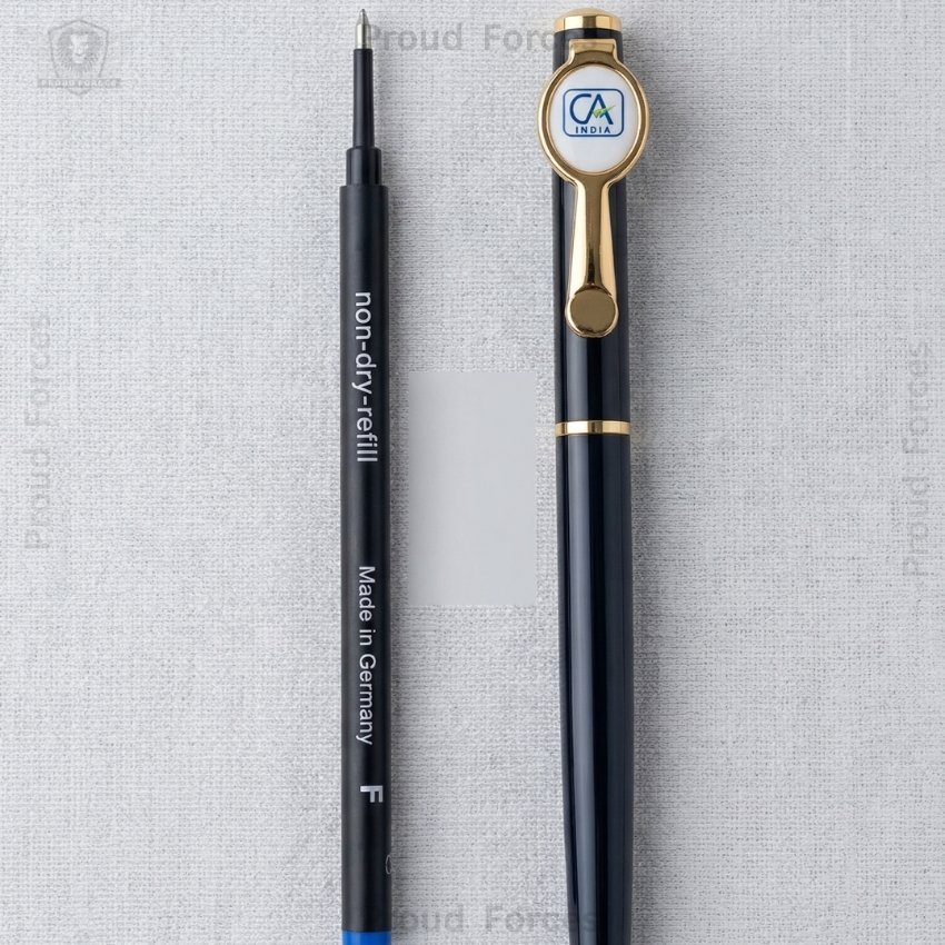 The Chartered Accountant Elite Pen from Proud Forces is a premium writing instrument specially designed for Chartered Accountants who value professionalism, precision, and identity in their everyday accessories. Its elegant black finish and gold-plated metal clip give the pen a refined executive appearance, while the cap features a CA India symbol that adds a distinctive professional touch. The pen is also fitted with a NON-DRY refill using Made in Germany F technology, ensuring smooth ink flow and dependable writing performance for regular office use, document signing, and premium gifting.