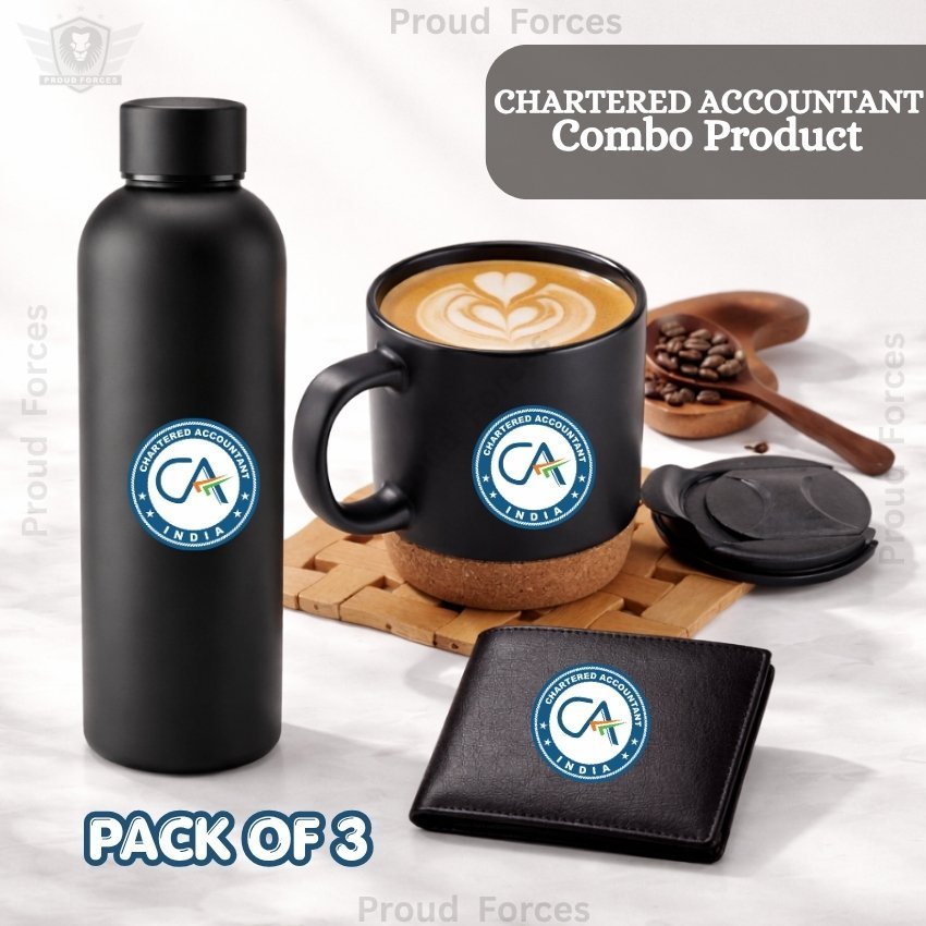 The Chartered Accountant Premium Combo Pack of 3 – Bottle, Coffee Mug & Leather Wallet by Proud Forces is a premium everyday utility combo designed for professionals who value style, comfort, and practical daily use. This set includes a matte finish insulated water bottle, a matte black coffee mug, and a 100% genuine leather wallet, all featuring a centered Chartered Accountant sticker for a matching premium look. It is ideal for office use, travel, daily routine, and gifting.
