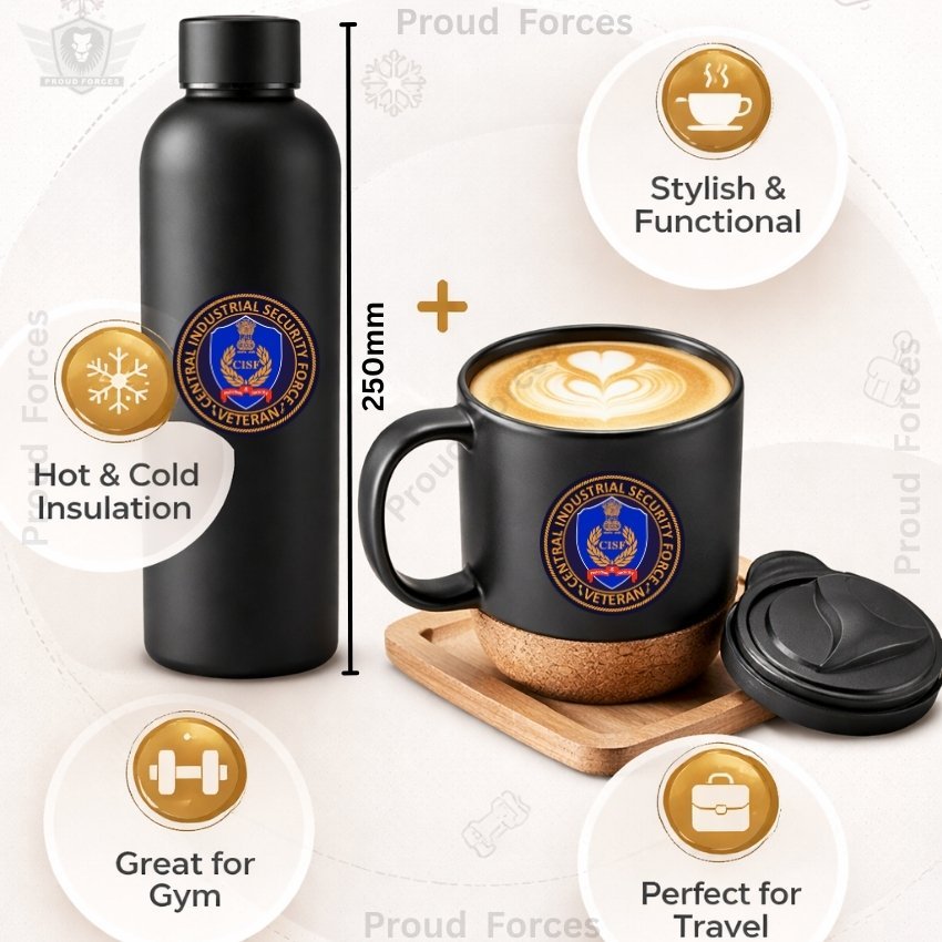 The CISF Veteran Matte Finish Bottle & Coffee Mug Combo Set by Proud Forces is a premium daily-use combo designed for comfort, durability, and practical utility. Both the insulated bottle and coffee mug feature a centered CISF Veteran sticker, creating a matching identity-inspired design suitable for office, travel, home, and gifting. The bottle provides long-lasting temperature retention, while the mug includes a removable cork base and leak-proof lid for easy everyday use.