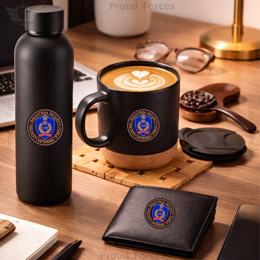 The CISF Veteran Premium Combo Pack of 3 – Bottle, Coffee Mug & Leather Wallet by Proud Forces is a premium everyday utility combo designed for comfort, durability, and daily convenience. This set includes a matte finish insulated water bottle, a matte black coffee mug, and a 100% genuine leather wallet, all featuring a centered CISF Veteran sticker for a matching premium look. It is ideal for office, travel, home, and gifting.
