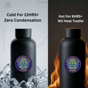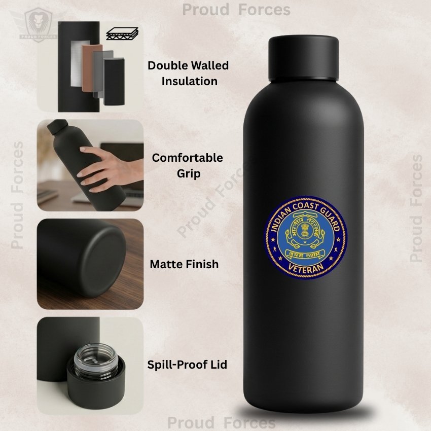 The ICG (Indian Coast Guard) Veteran Insulated Water Bottle by Proud Forces is a premium matte black stainless steel bottle designed for everyday durability, reliable temperature retention, and identity-driven style. Featuring a centrally placed ICG Veteran sticker, this bottle offers practical performance with a premium matte finish, making it ideal for office use, travel, outdoor activities, and daily routine.