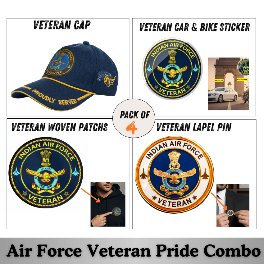 The Indian Air Force Proudly Veteran Combo Product by Proud Forces is a premium pride set designed for Indian Air Force veterans. This combo features a Proudly Veteran themed Air Force baseball cap, force car & bike stickers, veteran woven patches, and a veteran blazer pin—crafted to honour courage, service, and lifelong dedication to the nation.