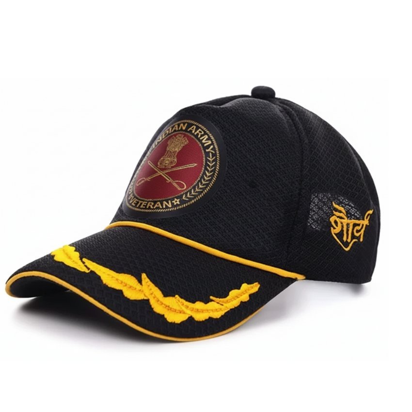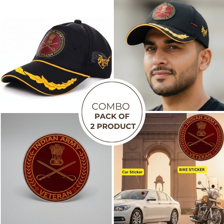 Proud Forces Indian Army Officer Veteran Cap & Car–Bike Sticker Combo is thoughtfully designed to honour the courage, discipline, and lifelong service of Indian Army officers and veterans. This premium combo includes a black Indian Army Officers’ Veteran Baseball Cap and a pack of 7 high-quality Army Veteran car & bike stickers, allowing veterans to proudly display their identity with dignity—both in daily wear and on their vehicles.