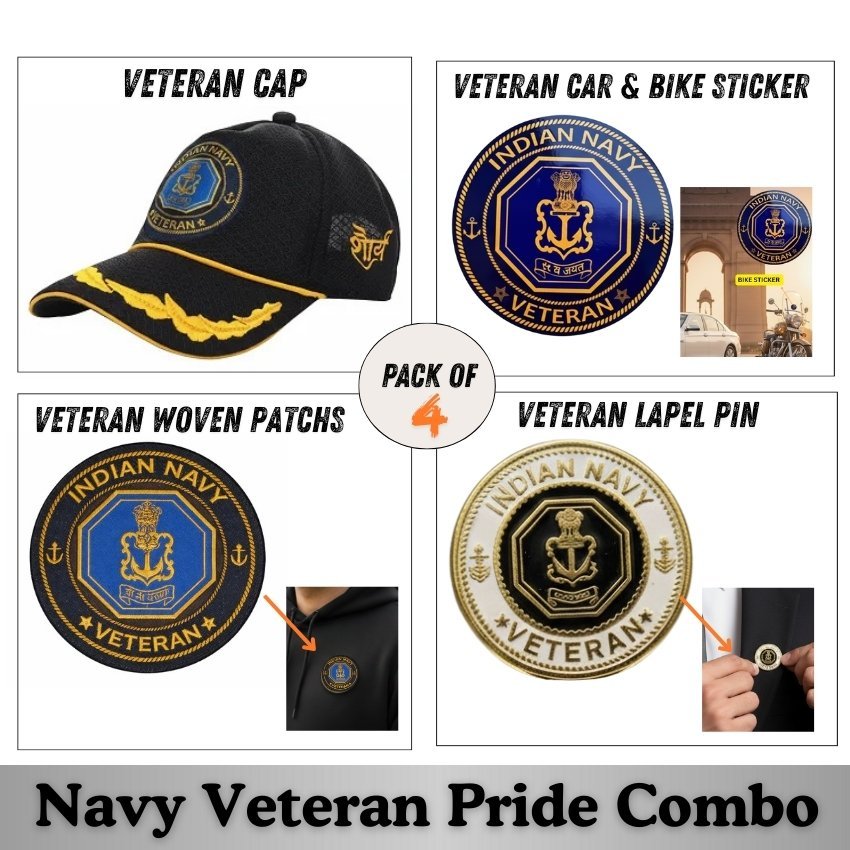 The Indian Navy Officer’s Veteran Combo Products by Proud Forces is a premium honour set specially curated for Indian Navy officers and veterans. This combo includes a premium officer-style Navy baseball cap, force car & bike stickers, veteran woven patches, and a veteran blazer pin—designed to reflect leadership, service, and national pride.
