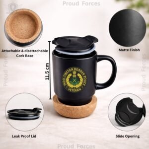 The ITBP Veteran Matte Finish Coffee Mug with Cork Base by Proud Forces is a premium black matte finish mug designed for daily comfort, practical use, and identity-focused style. It features a centrally placed ITBP Veteran sticker and comes with an attachable and detachable cork base, making cleaning simple and convenient. The leak-proof lid with slide opening allows easy sipping, making this mug suitable for tea, coffee, and other beverages during office hours, travel, or daily routine.