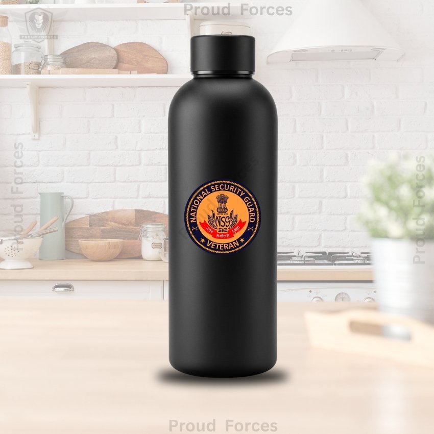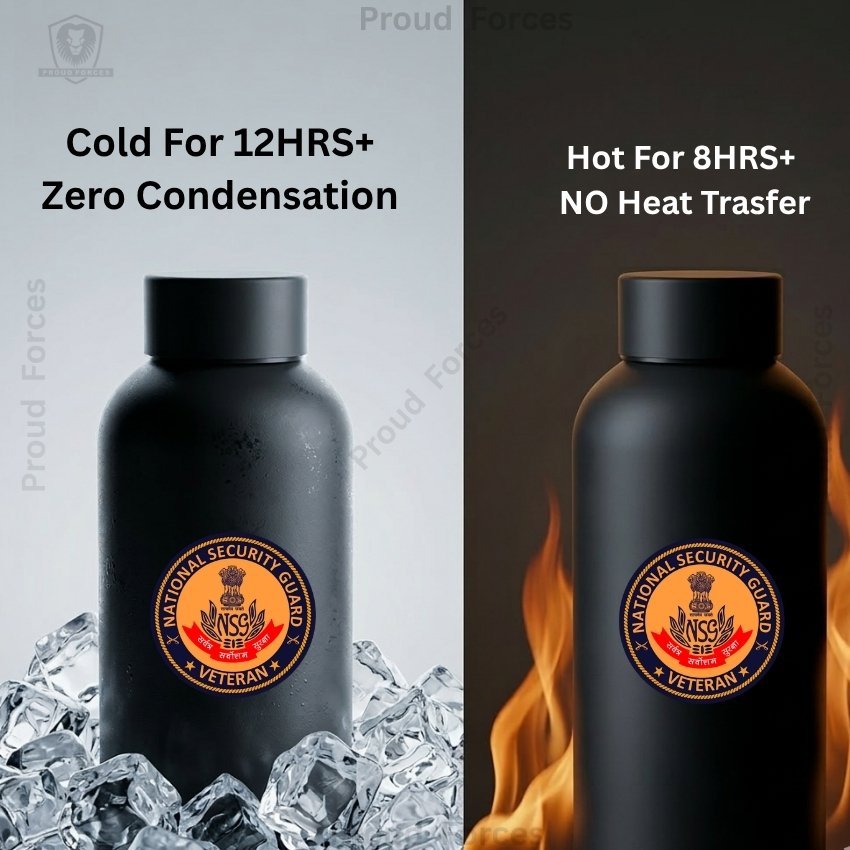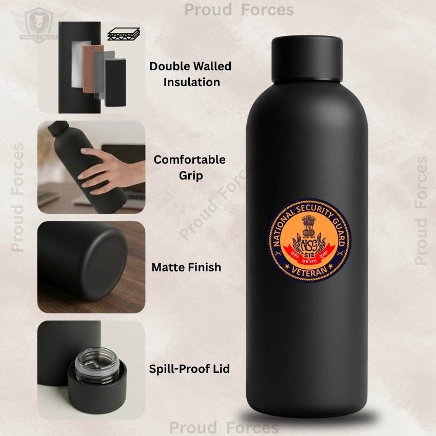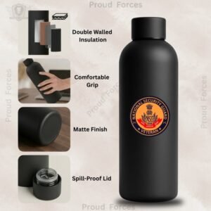 The NSG (National Security Guard) Veteran Insulated Water Bottle by Proud Forces is a premium matte black stainless steel bottle designed for everyday durability, efficient performance, and identity-driven style. Featuring a centrally placed NSG Veteran sticker, this bottle offers dependable temperature retention with a premium matte finish, making it suitable for office use, travel, workouts, and daily routine.