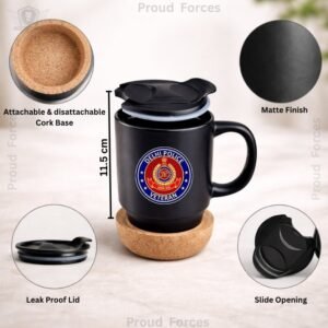 The Police Service Veteran Matte Finish Coffee Mug with Cork Base by Proud Forces is a premium black matte finish mug designed for daily comfort, practical use, and identity-focused style. It features a centrally placed Police Service Veteran sticker and comes with an attachable and detachable cork base, making cleaning simple and convenient. The leak-proof lid with slide opening allows easy sipping, making this mug suitable for tea, coffee, and other beverages during office hours, travel, or daily routine.