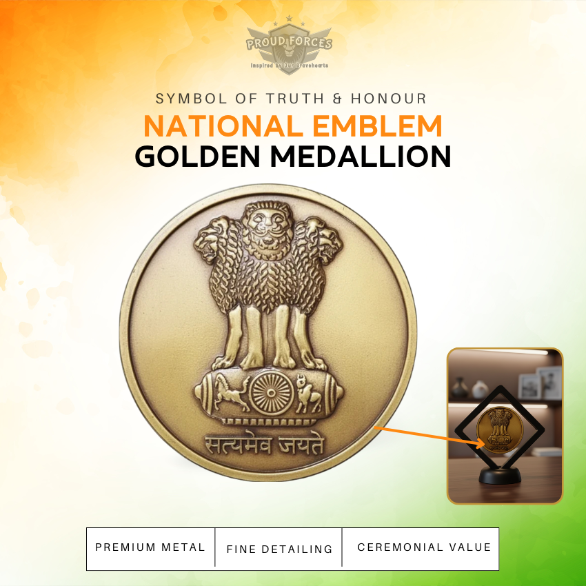 Showcase India’s pride with the Premium Quality National Emblem Golden Medallion – 2.5 Inch by Proud Forces. Featuring the iconic Ashoka Lion Capital, this beautifully crafted medallion is a symbol of truth, strength, and patriotism.