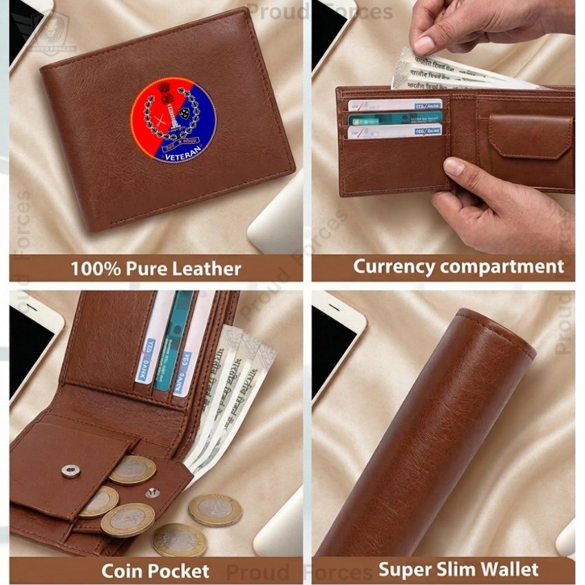The Rajasthan Police Veteran Brown Leather Wallet for Men by Proud Forces is a premium classic wallet crafted from 100% genuine brown leather, combining durability, elegance, and veteran-inspired pride. Featuring a centrally placed Rajasthan Police Veteran sticker, this super slim wallet keeps your cash, cards, coins, and essentials organized, making it perfect for daily use, office, or travel.