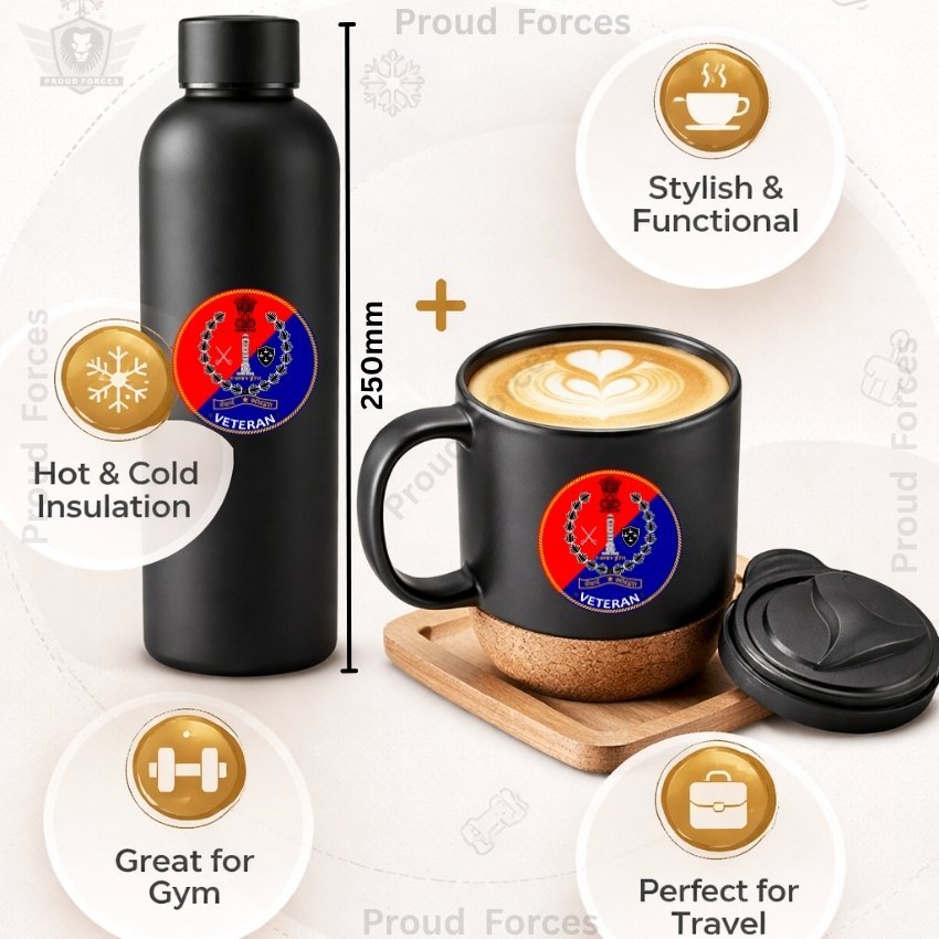 The Rajasthan Police Veteran Matte Finish Bottle & Coffee Mug Combo Set by Proud Forces is a premium daily-use combo designed for durability, comfort, and practical everyday convenience. Both the insulated bottle and coffee mug feature a centered Rajasthan Police Veteran sticker, creating a matching identity-inspired design suitable for office, travel, home, and gifting. The bottle offers reliable temperature retention, while the mug includes a removable cork base and leak-proof lid for smooth daily use.