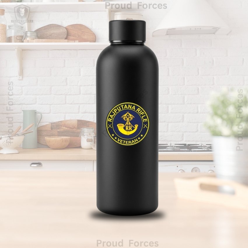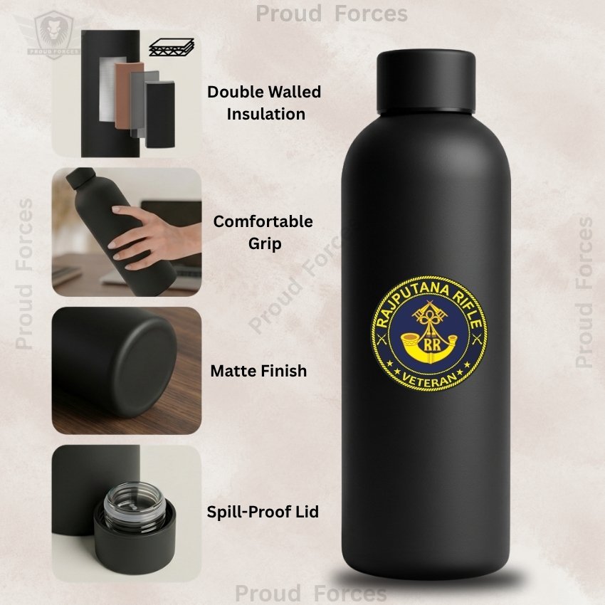 The Rajputana Rifle Veteran Insulated Water Bottle by Proud Forces is a premium matte black stainless steel bottle designed for daily durability, practical performance, and identity-driven style. Featuring a centrally placed Rajputana Rifle Veteran sticker, this bottle offers reliable temperature retention with a premium matte finish, making it ideal for office use, travel, gym, and everyday routine.