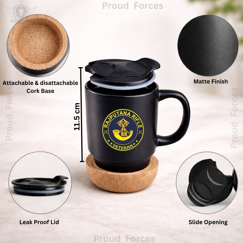 The Rajputana Rifle Veteran Matte Finish Coffee Mug with Cork Base by Proud Forces is a premium black matte finish mug designed for everyday comfort, practical use, and identity-focused style. Featuring a centrally placed Rajputana Rifle Veteran sticker, it comes with an attachable and detachable cork base, making cleaning quick and convenient. The leak-proof lid with slide opening ensures easy sipping, making this mug perfect for tea, coffee, and other beverages at home, office, or while travelling.