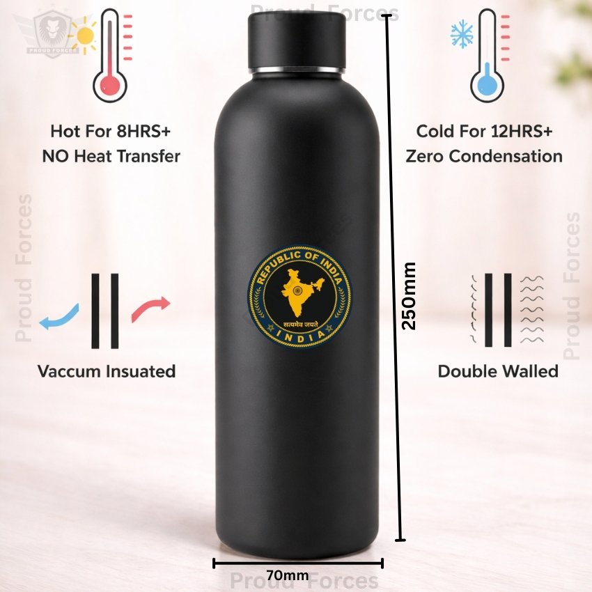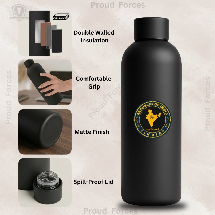 The Republic of India Insulated Water Bottle by Proud Forces is a premium matte black stainless steel bottle designed for everyday convenience, durability, and patriotic identity. Featuring a centrally placed Republic of India sticker, this bottle offers dependable temperature retention with a sleek premium finish, making it ideal for office use, travel, gym, and daily routine.
