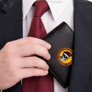 The Special Forces Black Leather Wallet for Men by Proud Forces is made from 100% genuine black leather and designed for premium everyday use. Featuring a centered Special Forces emblem sticker, this slim wallet offers organized storage for cash, cards, and essentials while maintaining a classic and professional look.
