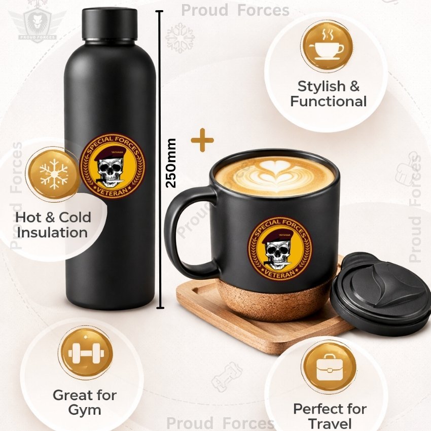 The Special Forces Veteran Matte Finish Bottle & Coffee Mug Combo Set by Proud Forces is a premium daily-use combo designed for durability, comfort, and practical everyday convenience. Both the insulated bottle and coffee mug feature a centered Special Forces Veteran sticker, creating a matching identity-inspired design suitable for office, travel, home, and gifting. The bottle offers reliable temperature retention, while the mug includes a removable cork base and leak-proof lid for smooth daily use.