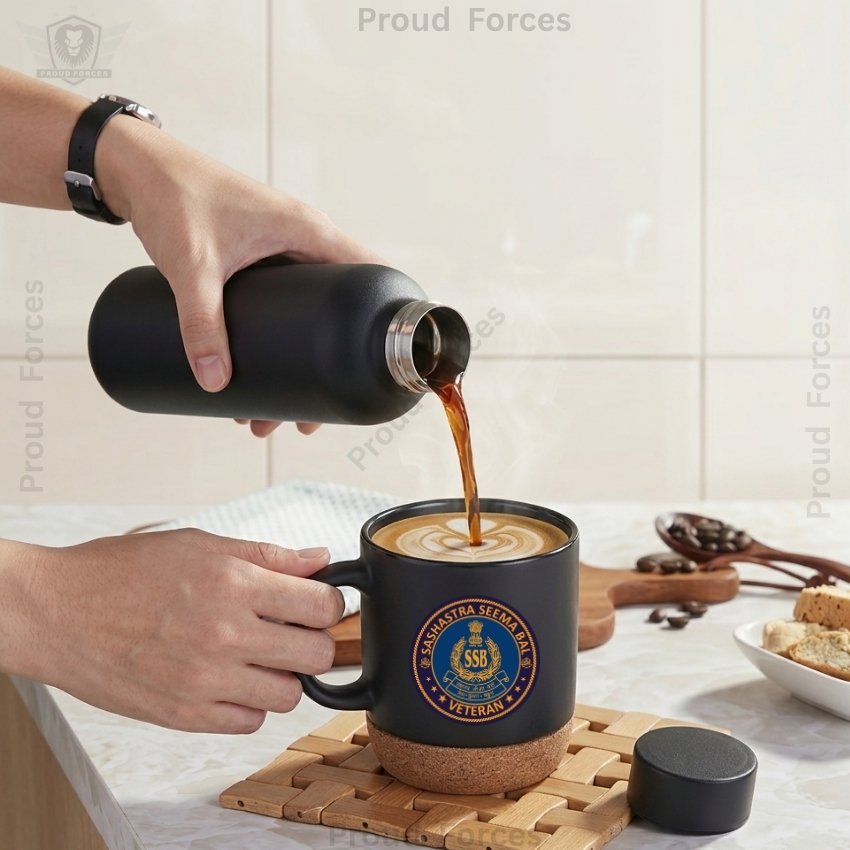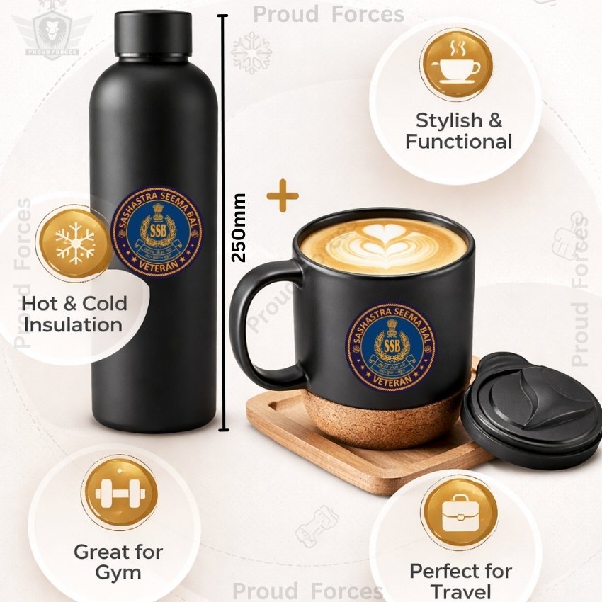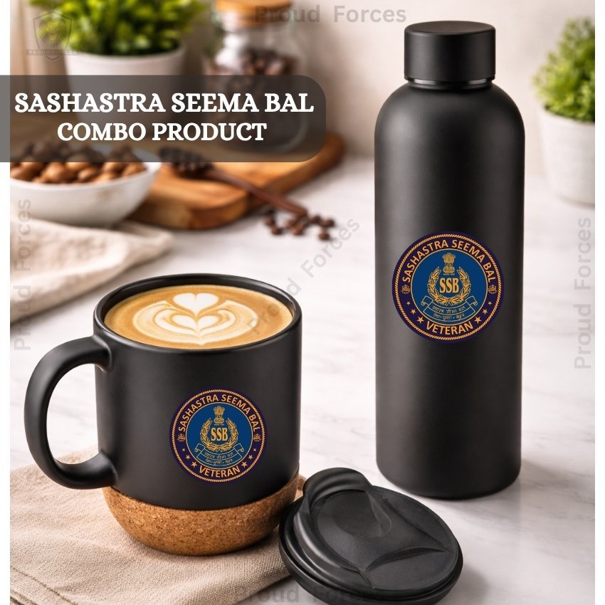 The SSB Veteran Matte Finish Bottle & Coffee Mug Combo Set by Proud Forces is a premium daily-use combo designed for durability, comfort, and practical everyday convenience. Both the insulated bottle and coffee mug feature a centered SSB Veteran sticker, creating a matching identity-inspired design suitable for office, travel, home, and gifting. The bottle offers reliable temperature retention, while the mug includes a removable cork base and leak-proof lid for smooth daily use.